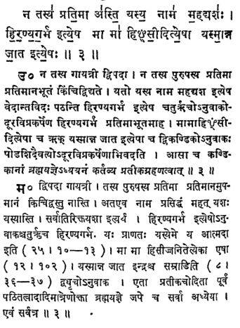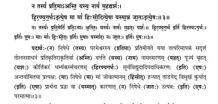 অনুবাদ: যাঁর মহান প্রসিদ্ধ যশ রয়েছে সেই পরমাত্মার কোনো প্রতিমা নেই। “হিরণ্যগর্ভ” আদি মন্ত্রে, “মা মা হিংসীত্” এই মন্ত্রে ও “য়স্মান্ন জাত” এই মন্ত্রে সেই পরমাত্মার বর্ণন রয়েছে।